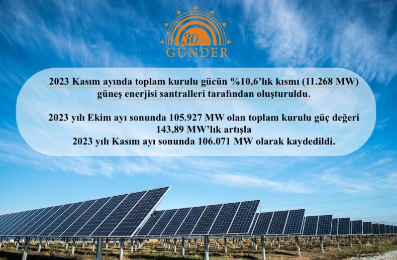 2023 Kasım ayında toplam kurulu gücün %10,6’lık kısmı (11.268 MW) güneş enerjisi santralleri tarafından oluşturuldu