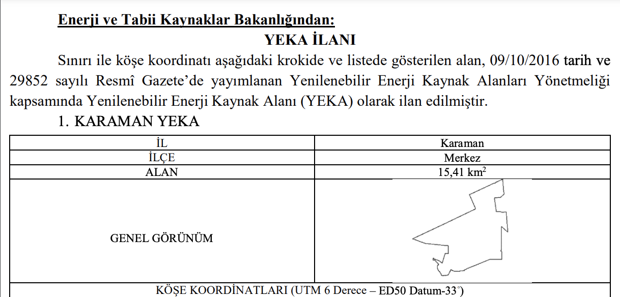 Enerji ve Tabii Kaynaklar Bakanlığı, Karaman ili sınırları içerisindeki bir alanı Yenilenebilir Enerji Kaynak Alanı (YEKA) ilan etti.